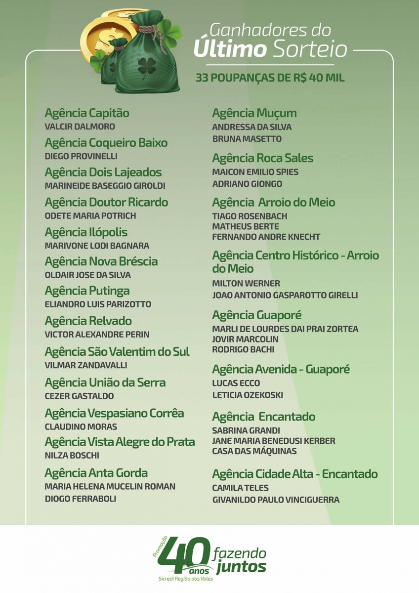 A Promoção, que iniciou em julho de 2021, foi a maior já realizada pela Cooperativa. Em 12 meses, mais de 1,7 milhão de cupons foram distribuídos. No total, foram sorteadas 400 poupanças, totalizando R$ 2,5 milhões em prêmios na região. Logo após o sorteio, ocorreu o show da banda Brilha Som, finalizando o evento de comemoração dos 40 anos do Sicredi Região dos Vales.