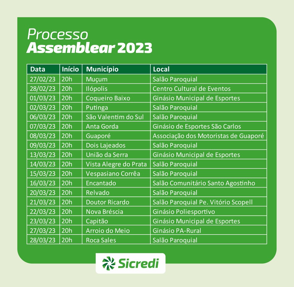 Para mais informações sobre as assembleias e confirmações de presença, os associados podem contatar a agência do Sicredi do seu município.